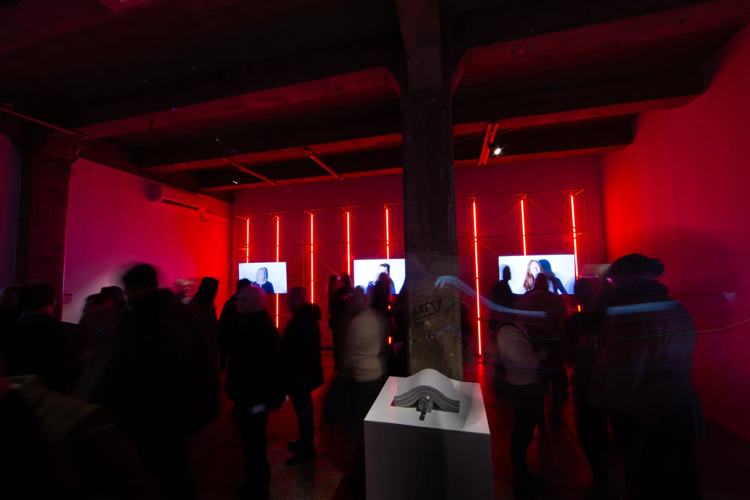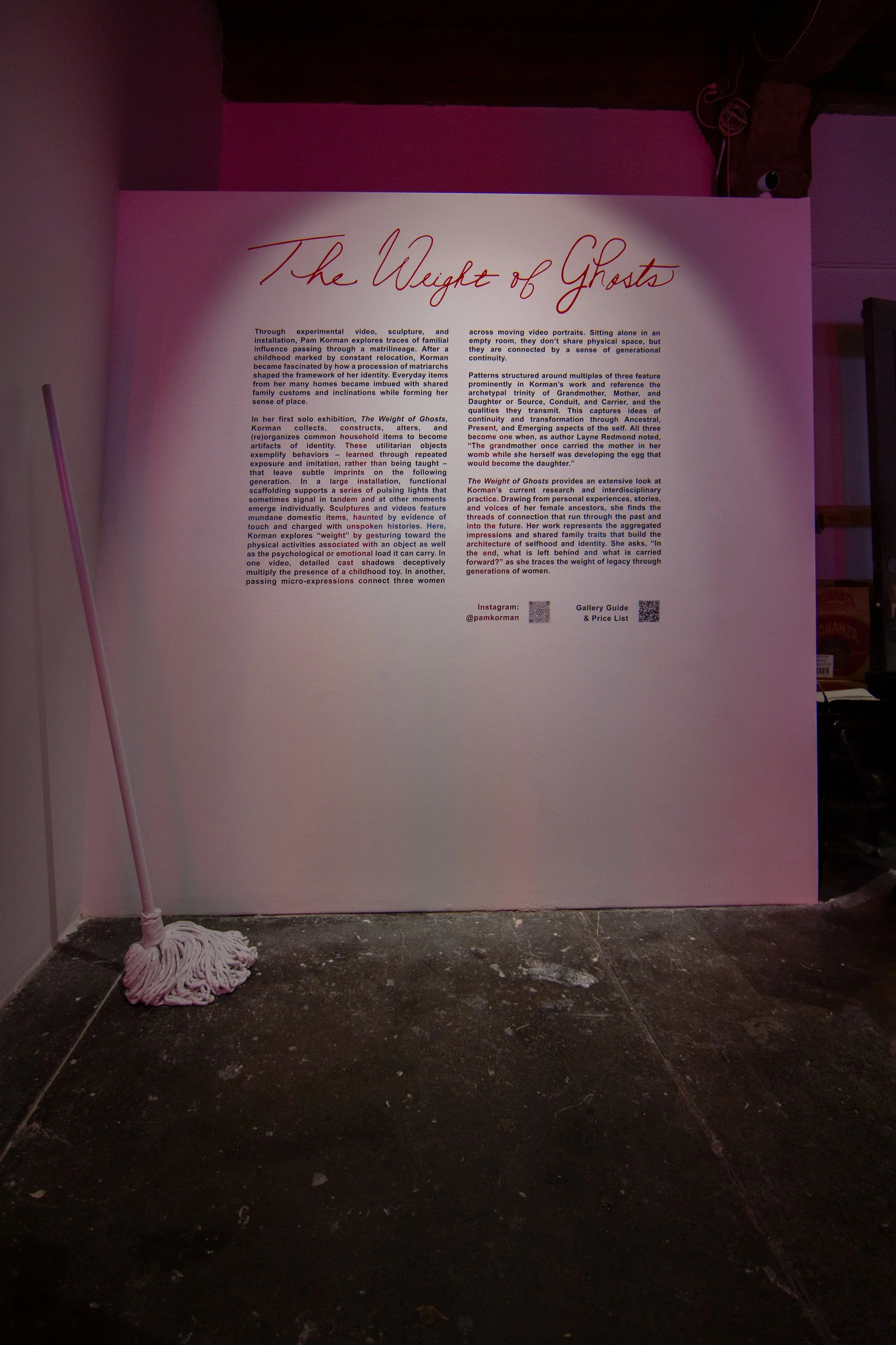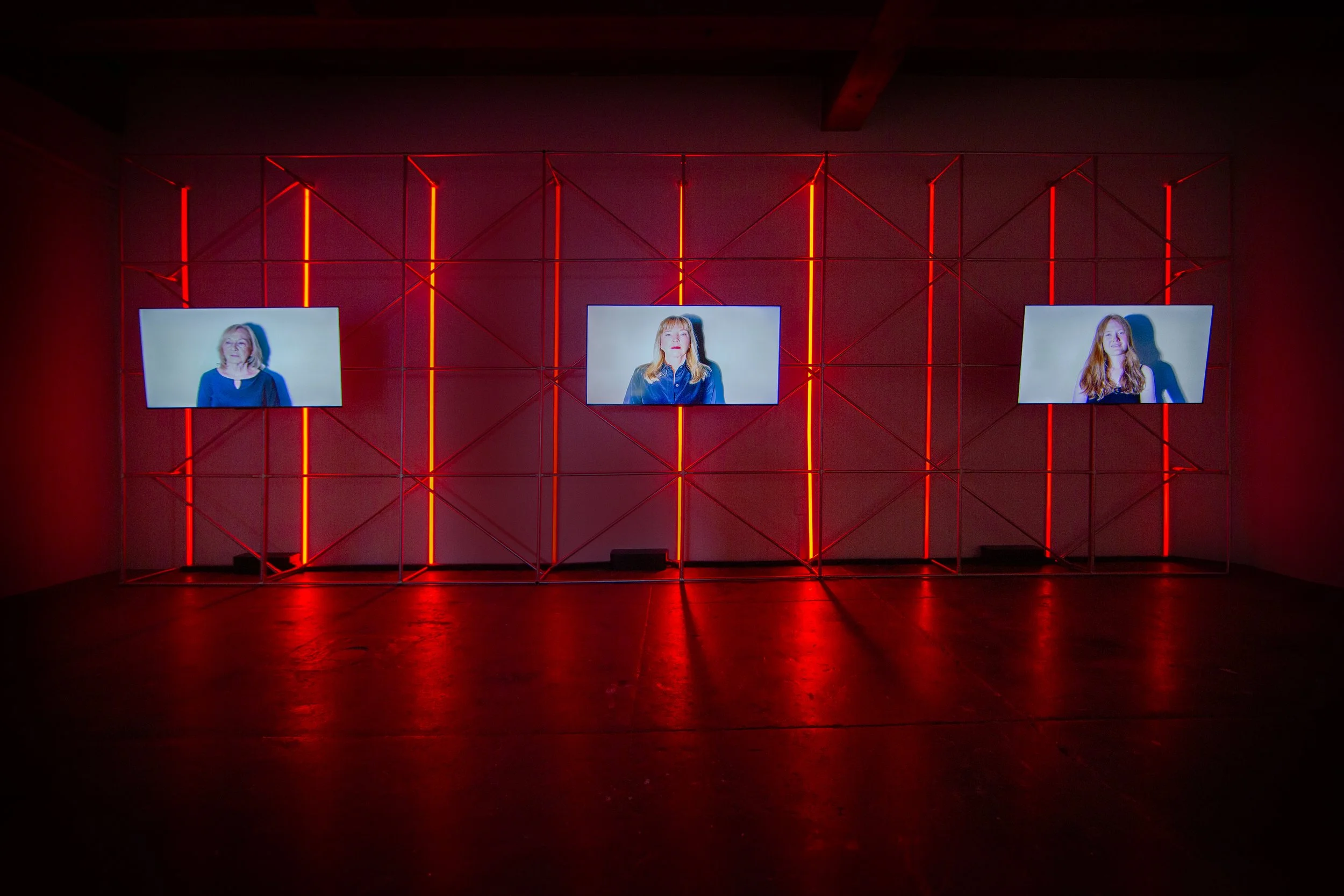 In her first solo exhibition, The Weight of Ghosts, Korman collects, constructs, alters, and (re)organizes common household items to become artifacts of identity. These utilitarian objects exemplify behaviors – learned through repeated exposure and imitation, rather than being taught – that leave subtle imprints on the following generation. In a large installation, functional scaffolding supports a series of pulsing lights that sometimes signal in tandem and at other moments emerge individually. Sculptures and videos feature mundane domestic items, haunted by evidence of touch and charged with unspoken histories. Here, Korman explores “weight” by gesturing toward the physical activities associated with an object as well as the psychological or emotional load it can carry. In one video, detailed cast shadows deceptively multiply the presence of a childhood toy. In another, passing micro-expressions connect three women across moving video portraits. Sitting alone in an empty room, they don’t share physical space, but they are connected by a sense of generational continuity.